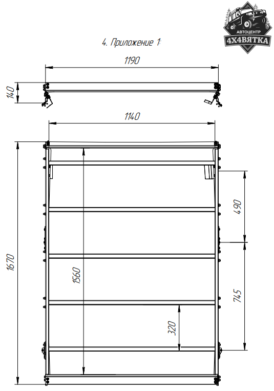 Описание товара: Багажник экспедиионный разборный устанавливается в штатные выштамповки крыши автомобиля. Багажник предназначен для перевозки полезного груза, установки дополнительных устройств и оборудования на крыше автомобиля. Изделие изготовлено из конструкционных сталей общего назначения и покрашено черным матовым цветом по технологии порошковой окраски металлов. Поставляется в разборном виде. Внимание! Перевозка грузов должна осуществляться в соответствии с требованиями настоящей инструкции, руководства по эксплуатации автомобиля и правил дорожного движения. Габаритные размеры (Д*Ш*В) мм: 1190х1670х140. Внутренние размеры ШхД мм: 1140х1560. Грузоподъемность для крыши 50 кг, для багажника 300 кг.