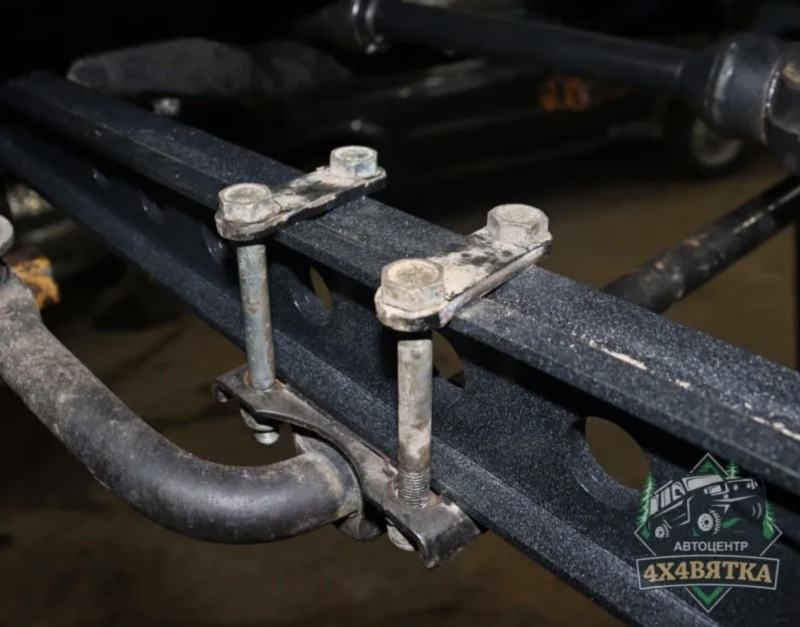 С усиленными продольными тягами невозможно использовать родной комплект крепления стабилизатора, поэтому мы произвели альтернативу.