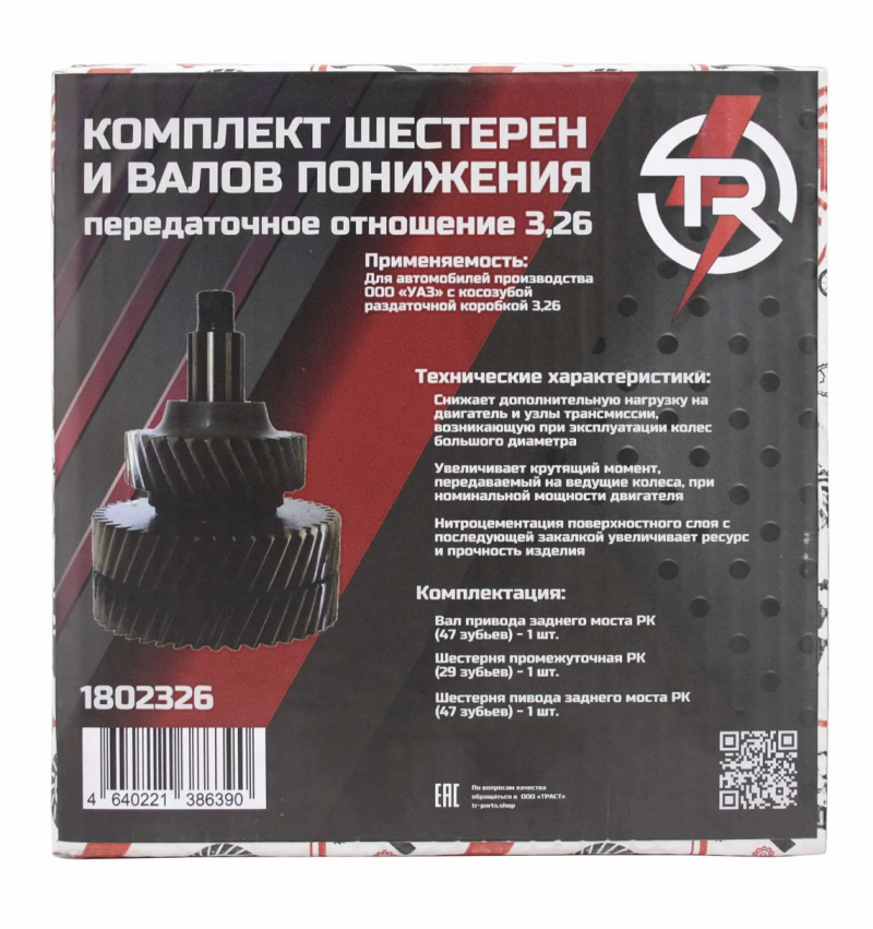 Комплект шестерен и валов TR для понижения косозубой раздаточной коробки (РК) 3.26 специально разработан для повышения проходимости и увеличения тяговых характеристик автомобилей УАЗ. Этот комплект обеспечивает значительное снижение передаточного отношения, что помогает справляться с самыми сложными условиями эксплуатации: грязь, снег, песок и другие труднопроходимые участки.