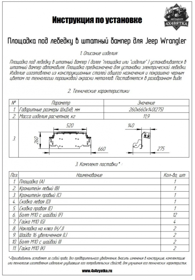 Тип оборудования: Площадка под лебедку в штатный бампер