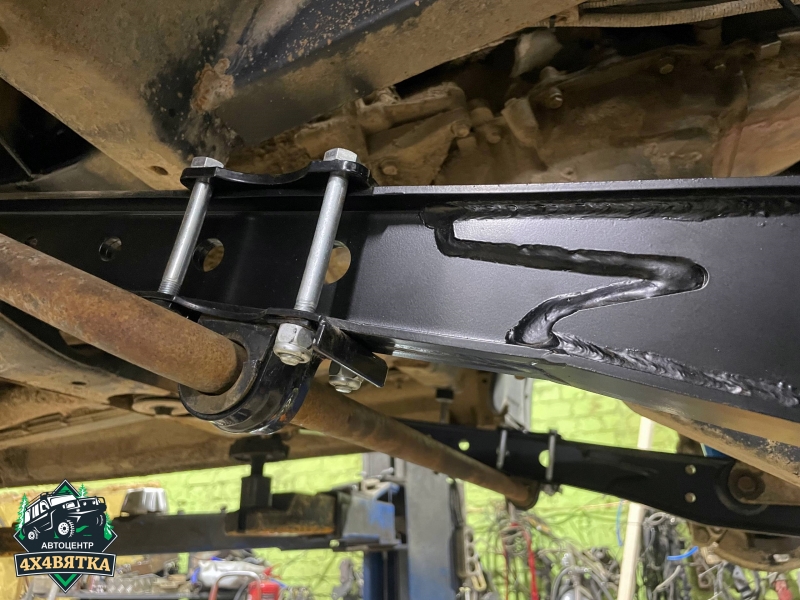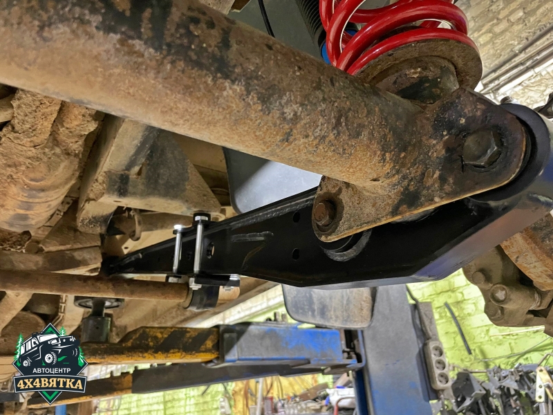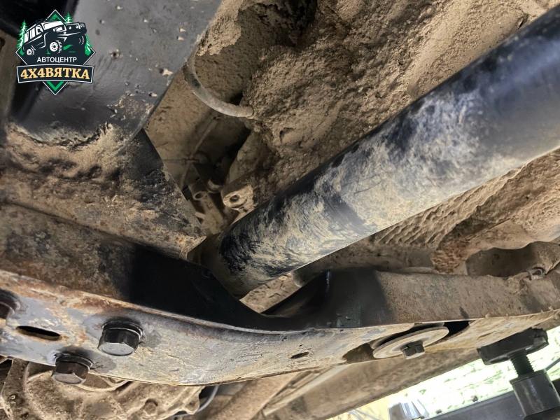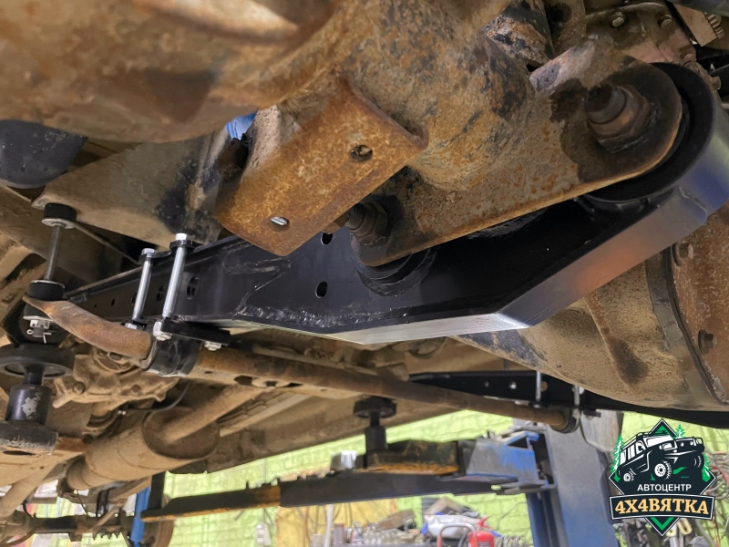 У продольных тяг уаз патриот с 2015 г.в: Хвостовик моста опускается примерно на 30 мм и это может привести к касанию передним карданом за траверсу КПП при крайних нижних положениях переднего моста. Возможно потребуется доработка траверсы.
