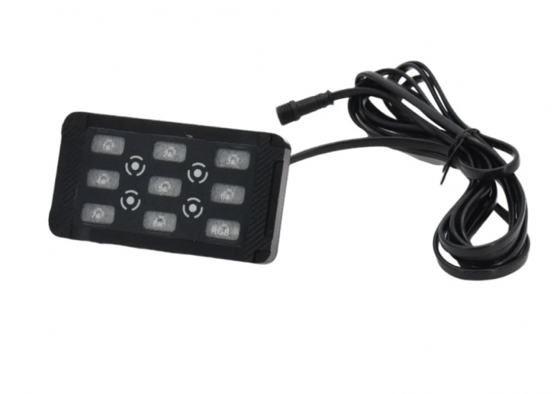 Модель ALO-BT07-8 гарантирует надежность и качество. Она совместима с напряжением 12 В и может быть использована в большинстве автомобилей. Максимальная мощность составляет до 1200 Вт, обеспечивая достаточно яркое и равномерное освещение.Пульт оснащен сенсорной панелью включения/выключения с подсветкой синими светодиодами, что придает ему стильный и современный вид. Главный переключатель кнопочного типа позволяет управлять включением/выключением всех каналов одновременно, обеспечивая максимальную удобность и эффективность.Размеры блока управления составляют 19x3,4x10,5 см, а панели переключателя - 11,5x1,5x6,6 см, что позволяет установить панель в любом удобном месте в салоне вашего автомобиля.